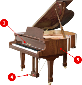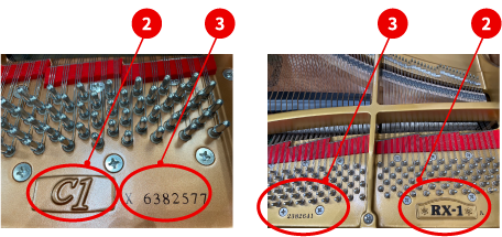 前屋根を開けて譜面台を外し、中側をお調べください。2種類の番号があります。大体のピアノは手前右端に