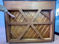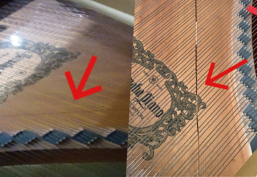 (アップライトピアノ) - 響板割れです。お部屋が乾燥している環境でおこる現象です。この場合は、ピアノの音、自体に大問題です。引き取り時に残念ながら減額されますのでご了承ください。