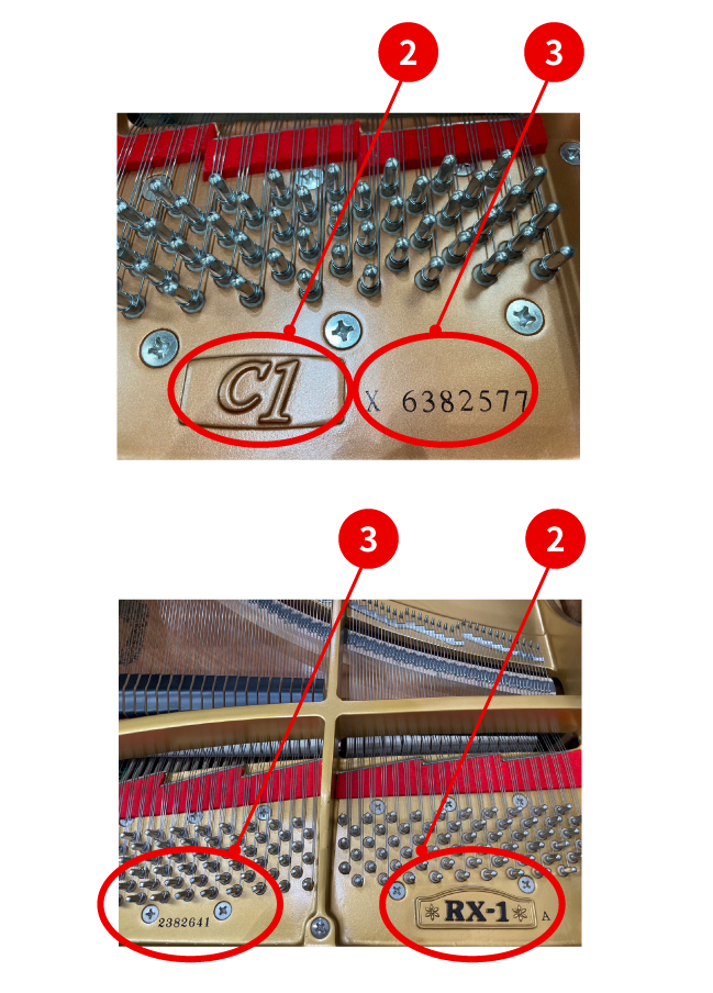 ヤマハは右端上に品番、製品番号が記載されており、カワイは右端上に品番、真ん中に製品番号が記載されています。